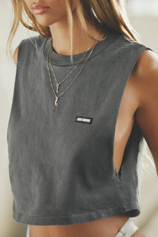 Relaxed-fit muscle tank with a crew neckline and exaggerated armholes, featuring our signature logo patch.